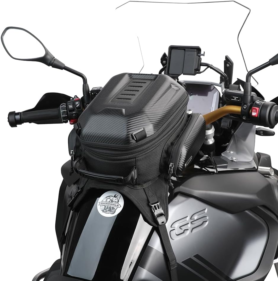 This Rhinowalk motorcycle tank bag offers expandable storage from 15 to 18 liters, making it suitable for daily commuting or longer rides. It’s designed to sit securely on the fuel tank and provides easy access to personal items like gloves, phone, wallet, tools, or small gear. The waterproof construction helps protect contents in rain and different weather conditions. Its carbon-fiber black look keeps it low-key and functional rather than flashy. The bag is structured to stay stable while riding and can be used in various weather without constant adjustment.